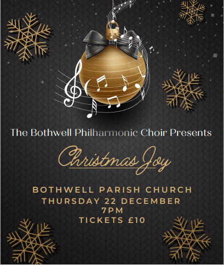 Dec 8 2022 Image The Bothwell Philharmonic Choir and Special Guests present ‘Christmas Joy’ in Bothwell Parish Church on Thursday 22nd December 2022. Tickets £10 from choir members. Share this: Click to share on Facebook (Opens in new window) Facebook Click to print (Opens in new window) Print More Click to share on LinkedIn (Opens in new window) LinkedIn Click to share on Reddit (Opens in new window) Reddit Click to share on Tumblr (Opens in new window) Tumblr Click to share on Pinterest (Opens in new window) Pinterest Like Loading... Related